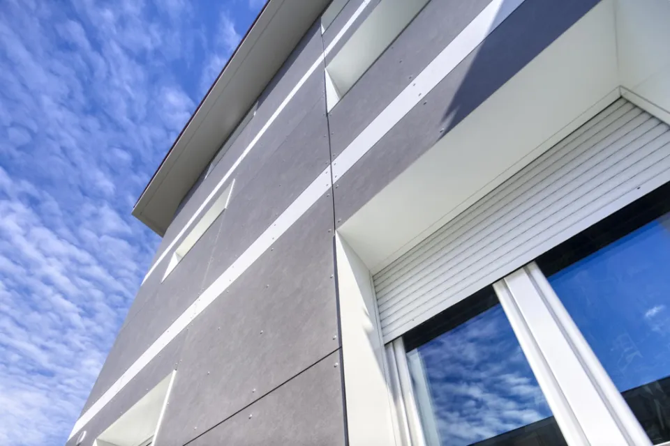 Trespa Meteon panels are compact high-pressure decorative laminates (as per EN 438-6:2016), available in various sizes, thicknesses (starting at 6 mm for exterior use), and colours.