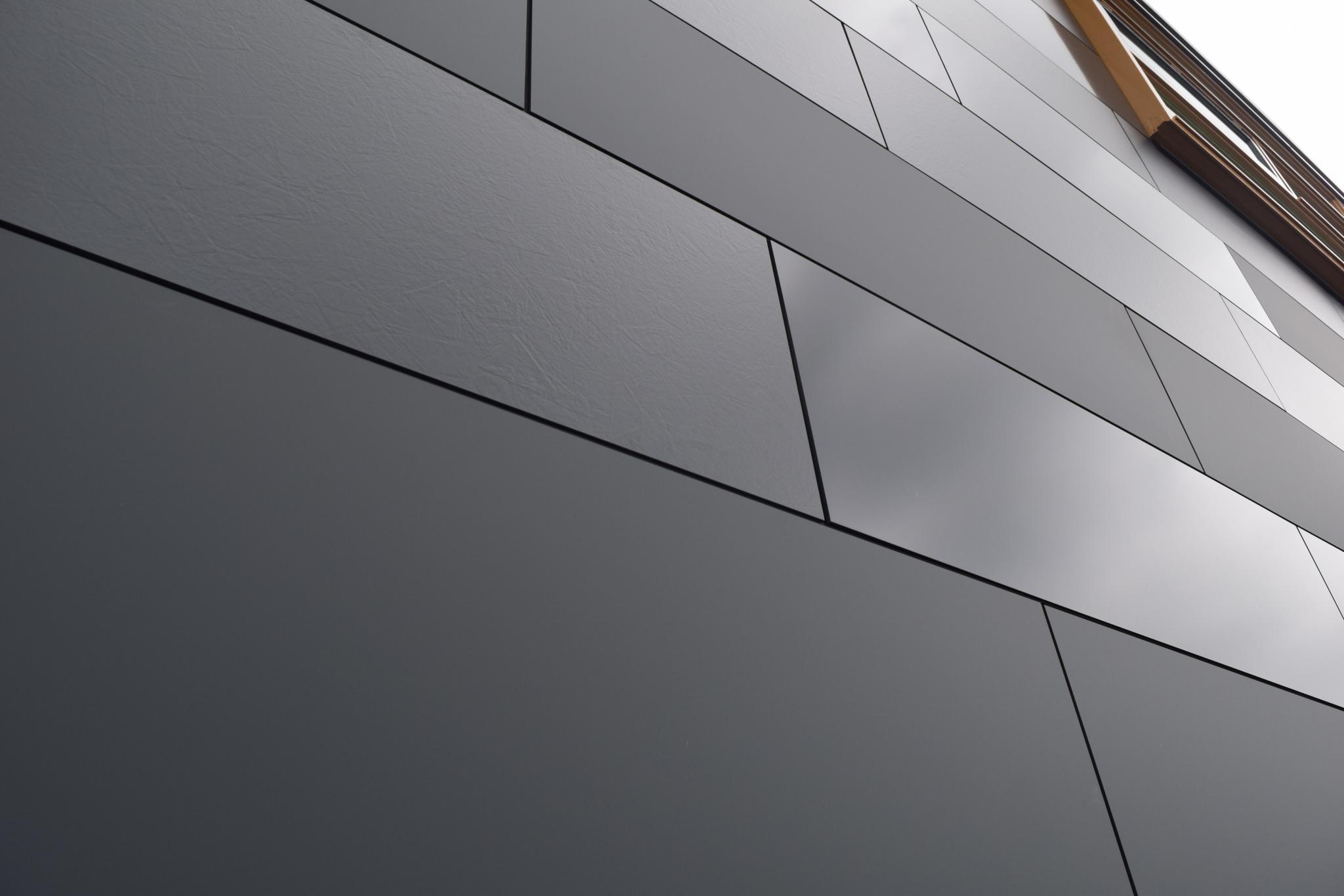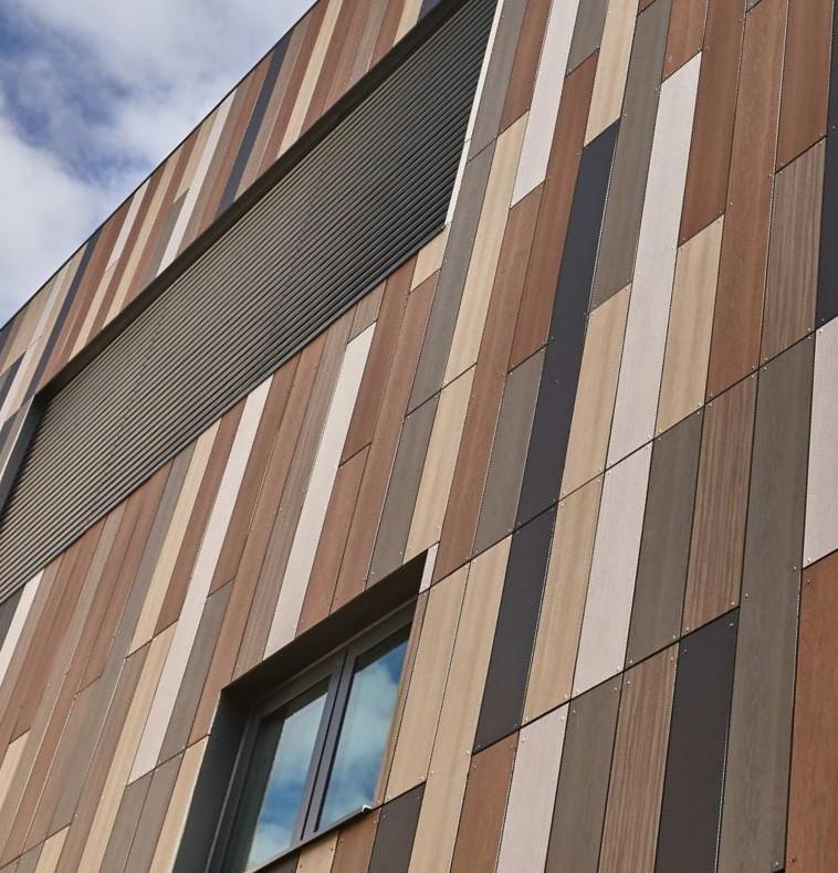 Anwendungen im Außenbereich: Die Platten eignen sich für vorgehängte hinterlüftete Fassadensysteme, Balkonverkleidungen und Sonnenschutzelemente. Zur Auswahl stehen verschiedene Designlinien wie Metallics, Lumen, Focus, Naturals und Woods. Unterschiedliche Farb- und Oberflächenkombinationen ermöglichen eine präzise Abstimmung auf architektonische Konzepte.