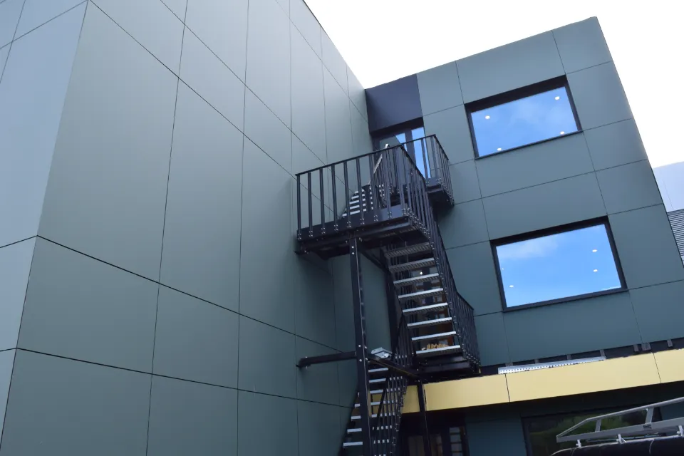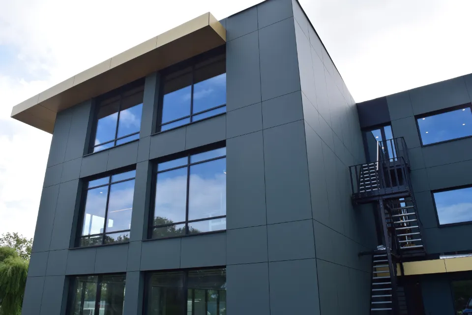 On the edge of the Dutch Westland, Van der Valk Solar Systems wanted a new building that would visibly reflect its core business: solar energy and smart mounting systems. Together with architect Aad Bom, the team chose a façade in Trespa® Meteon® Olive Green L3673 Diffuse from the Lumen collection – a natural green that connects with the surrounding landscape while turning the building into a landmark along the Galgeweg.