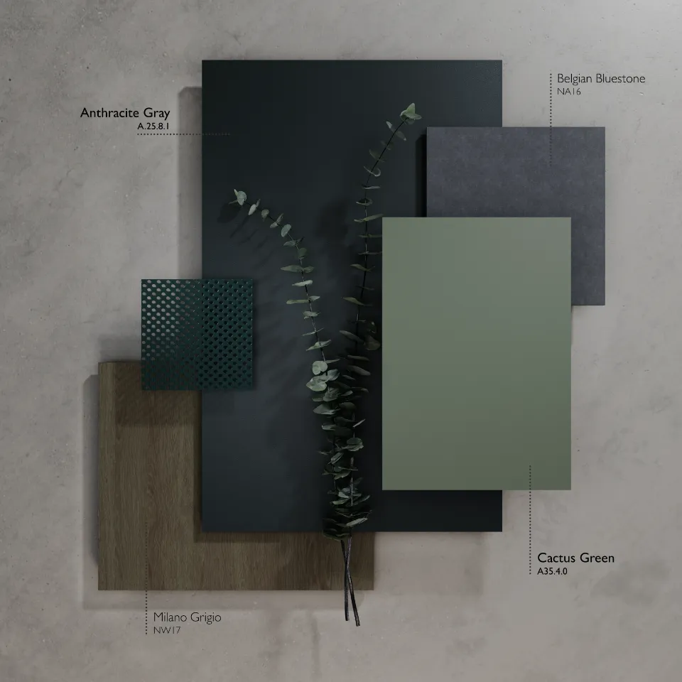 Le città moderne richiedono facciate che bilancino durabilità, identità e precisione progettuale. La palette Trespa Urban offre un’espressione materica sofisticata, combinando grigi architettonici profondi e texture ispirate ai minerali con un accento verde distintivo che introduce una freschezza sottile senza compromettere la forza compositiva.
