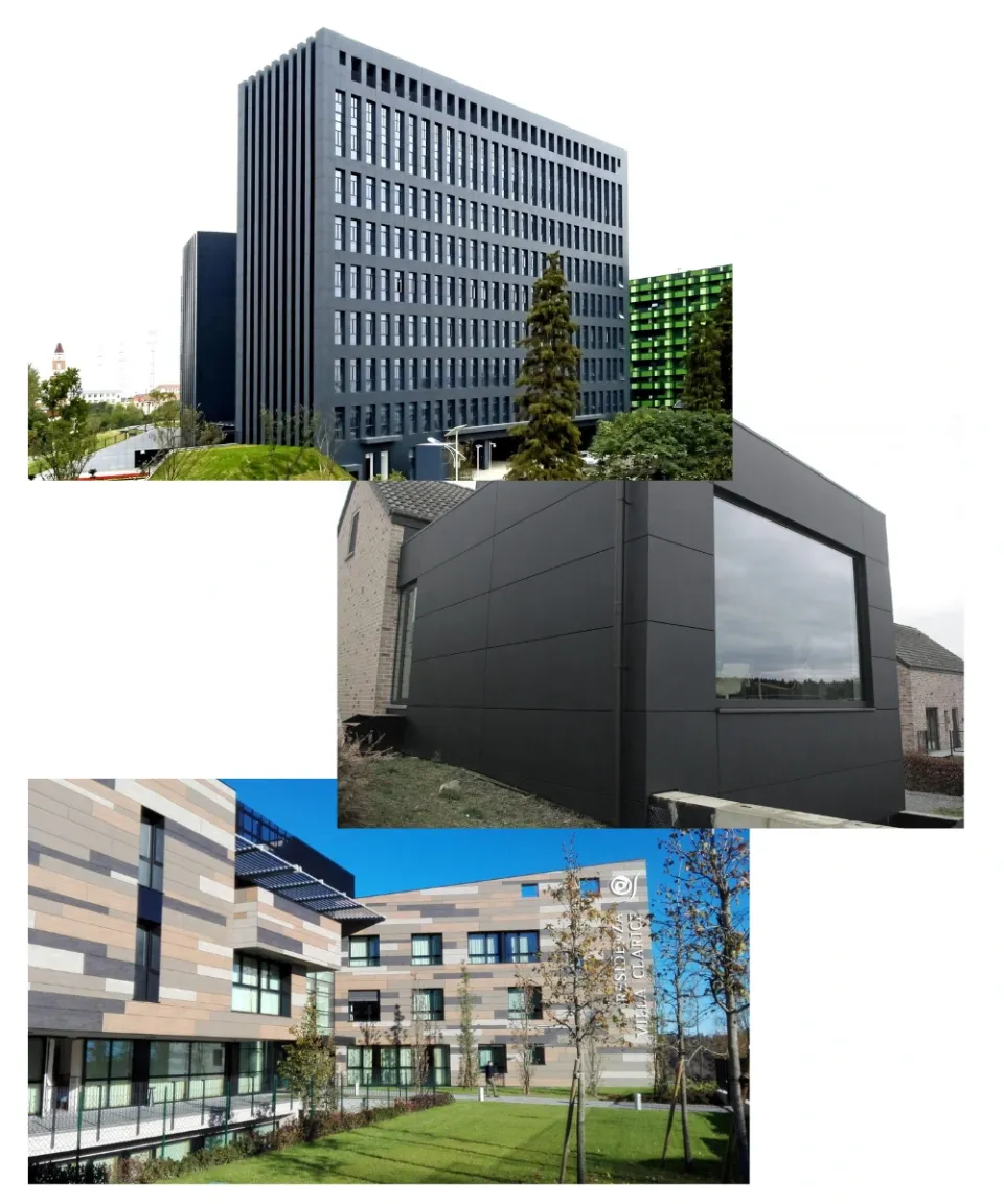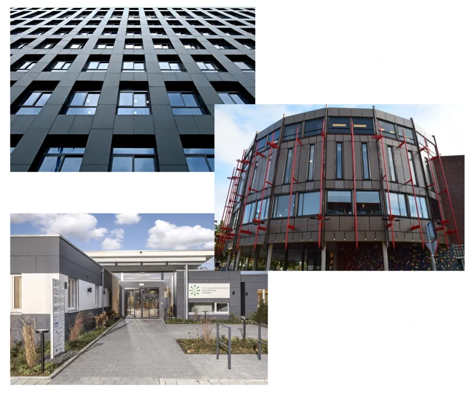 Grigio antracite (Trespa® Meteon® Uni Colours – A25.8.1): crea una presenza scultorea, definendo bordi e volumi. Nell'Ufficio Ambientale di Jiangyin, fissa la facciata mentre gli accenti verdi evidenziano le zone di circolazione per un look urbano dinamico.