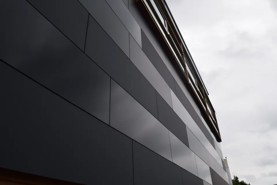 De nieuwe gevel is opgebouwd met Trespa® Meteon® Lumen, gecombineerd met Trespa® Meteon® Uni Colours. Eén kleur met vier verschillende gedaanten dankzij slimme inzet van Trespa® Meteon® Lumen. Hierdoor reageert de gevel sterk op licht: afhankelijk van tijdstip, seizoen, weer en kijkrichting verandert de plasticiteit van het gebouw.